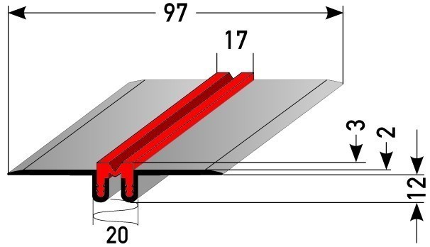 - GRÖSSE: Das Dehnungsfugenprofil verfügt über die Abmessungen 97 x 3 x 2000 mm und hat eine Einfasshöhe von 3 mm.