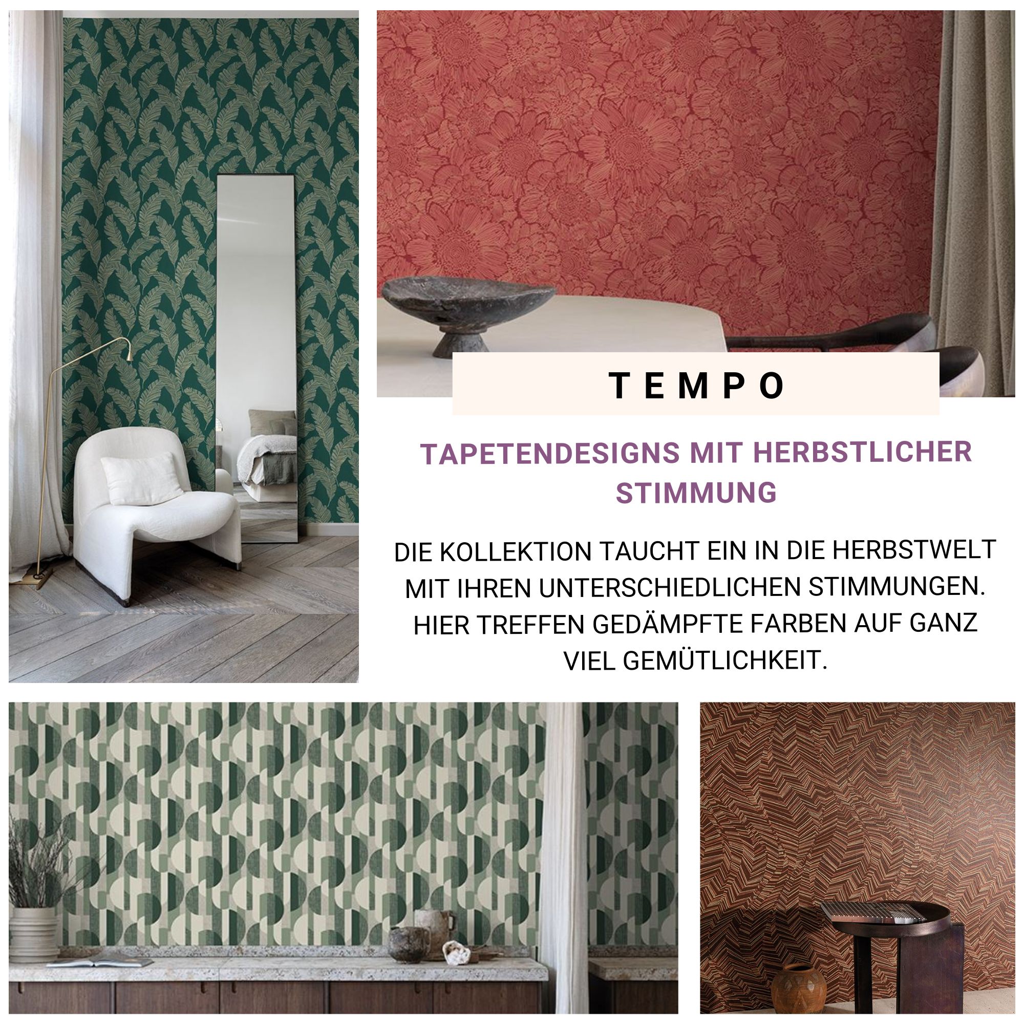 Welches Bild haben Sie vor Augen, wenn Sie an den Herbst denken? Vielleicht Braun-Goldene Bäume, ein flackernder Kamin und ganz viel Gemütlichkeit? Mit der Kollektion Tempo bringt Grandeco Ihnen ebene jene Herbstgefühle in Ihr zuhause. Erfreuen Sie sich an den tollen Texturen, Kontrasten und Motiven des Herbstes an Ihren Wänden und lassen Sie Ihr zuhause zu Ihrem sicheren Kokon werden.